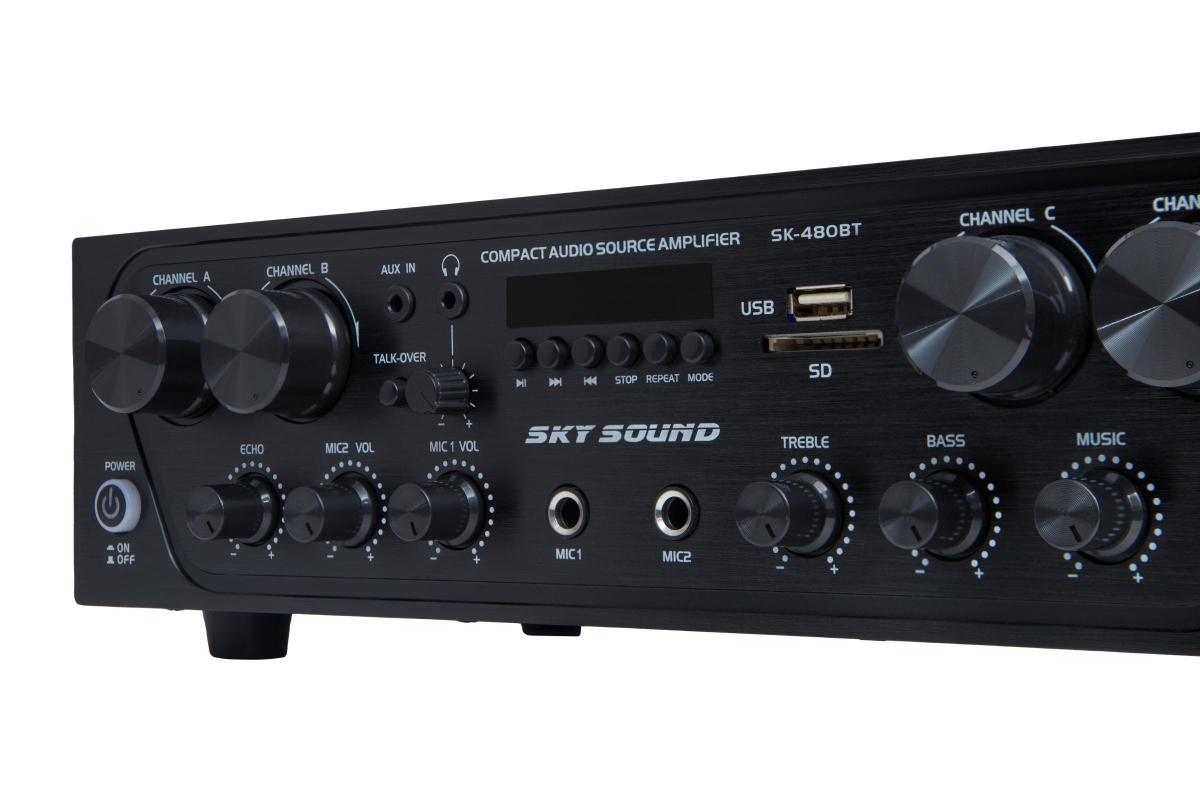 SKY SOUND SK-480 (4*80W) - многозонный усилитель мощности с четырьмя независимыми каналами, каждый из которых имеет отдельную регулировку громкости. Идеально подходит для организации звука в нескольких помещениях или создания домашней аудиосистемы с гибкими настройками.